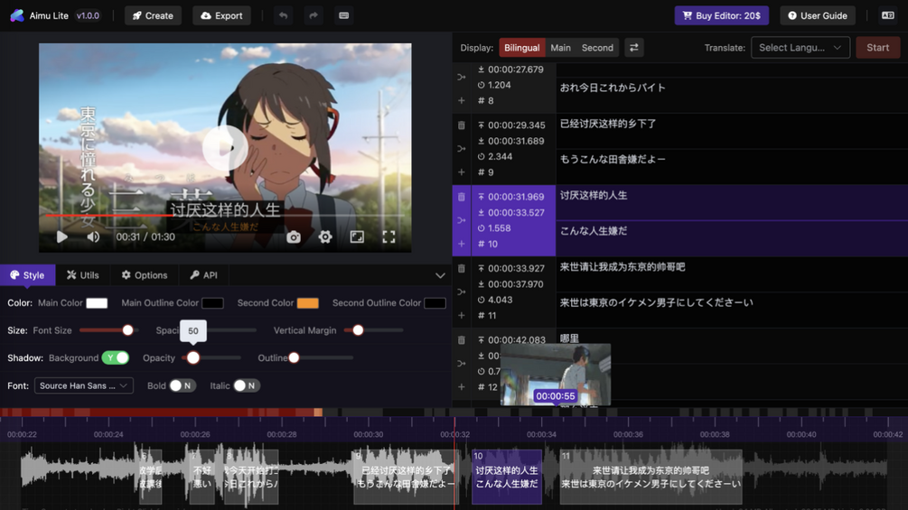 Aimu is a lightweight online subtitle editor. It's feature-rich, easy to operate, and convenient to deploy. All data is saved locally and won't be uploaded to servers. If you like this editor, please consider purchasing it and making it your own subtitle editor.